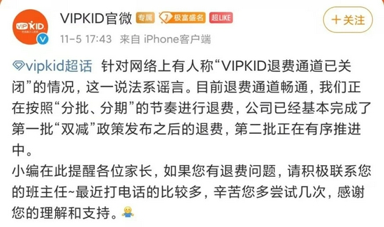 11月5日,VIPKID曾在官方微博发布声明表示,网络上“VIPKID退费通道已关闭”的说法系谣言,目前退费通道畅通,正在按照“分批、分期”的节奏进行退费,公司已经基本完成了第一批退费,第二批正在有序推进中。不过,声明中并没有提及分批退款的具体时间表。