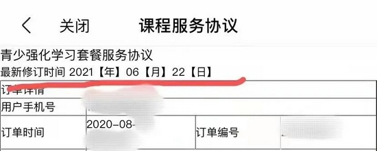多位受访家长反映,后台显示他们的电子协议在今年6月做过修订,修订后的协议包含超过一定期限会扣除违约金或有权拒绝退费的相关条款,而原先的条款已被覆盖,无法查询,这也是退费过程中的一个争议焦点。
