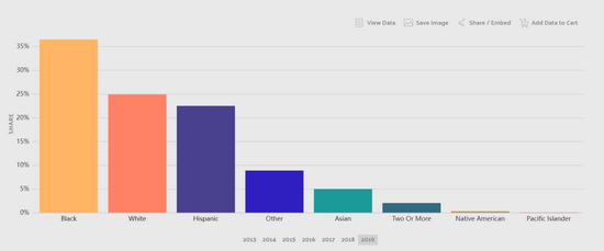2019年芝加哥贫困人群种族分布图。其中,非裔占比超过35%以上。