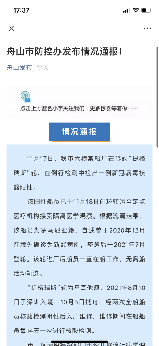 11月17日,我市六横某船厂在修的“提格瑞斯”轮,在例行检测中检出一例新冠病毒核酸阳性。