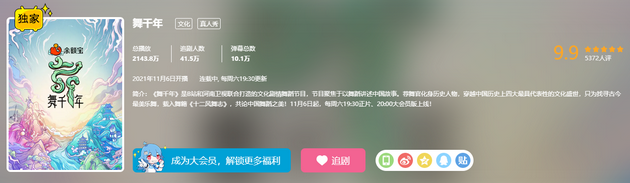 以舞代武,这句话成为河南卫视与Bilibili上线节目《舞千年》的开场白。这个在11月6日上线的节目,很快在网络阵地上找到了自己的位置,在B站上线一周多,截至发稿前线上评分高达9.9分,拥有2143.8万播放量,10.1万弹幕,41.5万追剧的数据。伴随着节目热度逐渐发酵,共八集的节目,在第二集上线后的工作日单天播放数据,已高达百万。