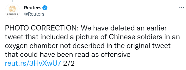 在距离第二次推送的4个小时后,路透社对上述两次操作发布了所谓的“更正声明”中,正如我们之前分析的那样,路透社把此举称为“配图错误、造成了冒犯”,表示自己删掉了第一个问题推文。