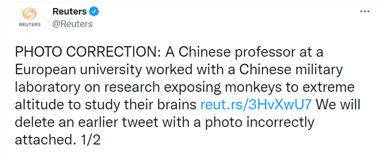 笔者翻阅路透社官方推特发现,在19日早上6点12分,也就是上述那条问题推文发出的几个小时后,这张与报道内容无关的“解放军战士吸氧”图片,又再一次搭配“猴子试验”的新闻,被路透社改头换面地重新发了一次。
