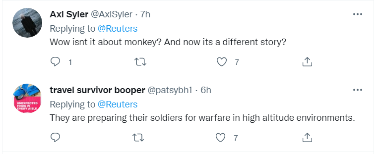 等于说,路透社依然在把解放军战士照片和“猴子”联系起来,只是相比之前直接写在导语里,他们新推文把“猴子”这个字眼藏得更深了一些。这意味着他们非常清楚自己图文产生的联想以及造成的恶劣影响,但他们并不打算把真正存在问题的图片换掉,而是对上一条推文的种族歧视意味做了更精致的包装和掩饰。截至发稿时,路透社仍没有删掉这条推文和下面的配图。