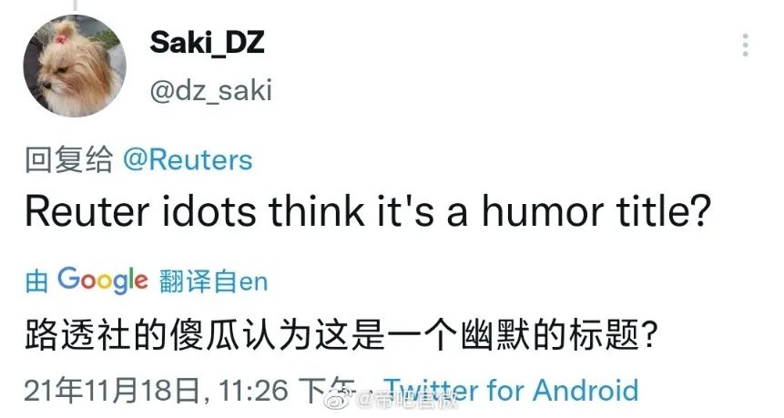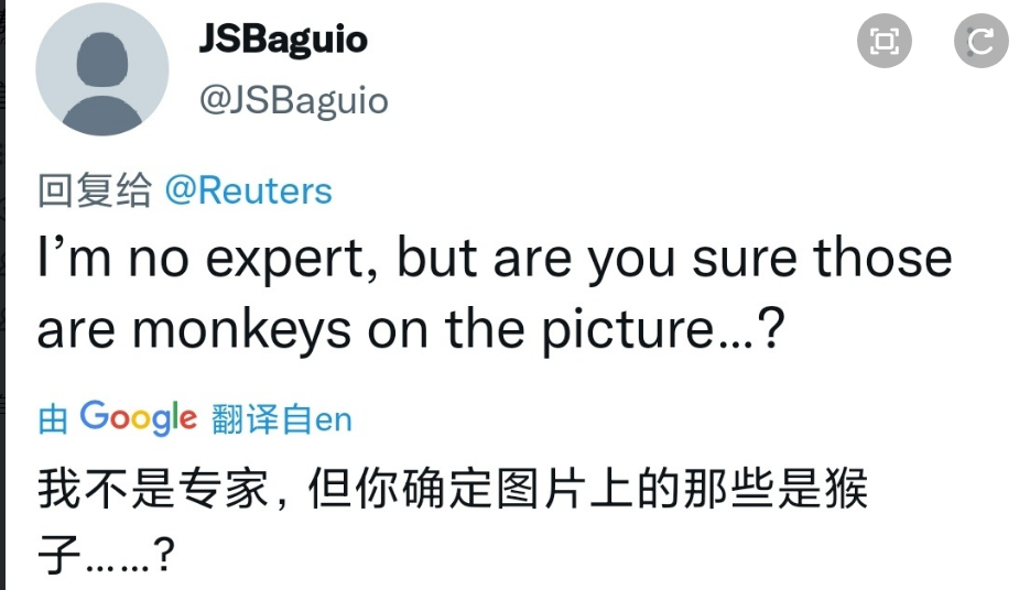 在微博@帝吧官微和其他网友的截图中我们可以看到,许多看到这一新闻的读者都产生了类似的联想,并对路透社的做法产生了质疑。也有不少中外网友认为路透社这一做法是侮辱中国人是“猴子”,是一种恶毒的种族主义行为。