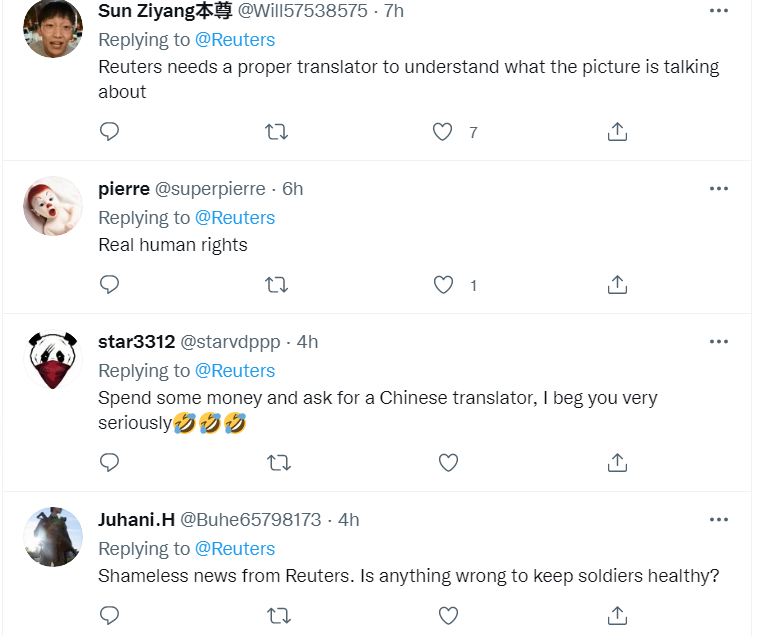 据我们查阅国防部官网、中国军网的页面发现,被路透社截图的这条新闻原内容说的是微压氧舱落户新疆军区,和所谓“观察猴脑开发新药”完全无关。路透社这一操作的结果就是,所有看到这条推文的人,都不约而同地感受到了这样一个恶毒的暗喻:解放军战士是猴子。