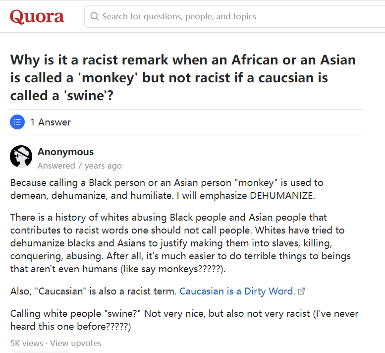 产生这种联想并不是因为读者们太过敏感,而是在西方语境中,称呼对方为“猴子”一直是常见的种族侮辱方式,在类似下图这样的英语论坛中,都曾有许多人讨论过这一现象。这种多用于针对亚非人种的歧视称呼,包含了将对方“非人化”的意味,也隐含了被这样称呼的族群“不配”享有人权的极端思想。
