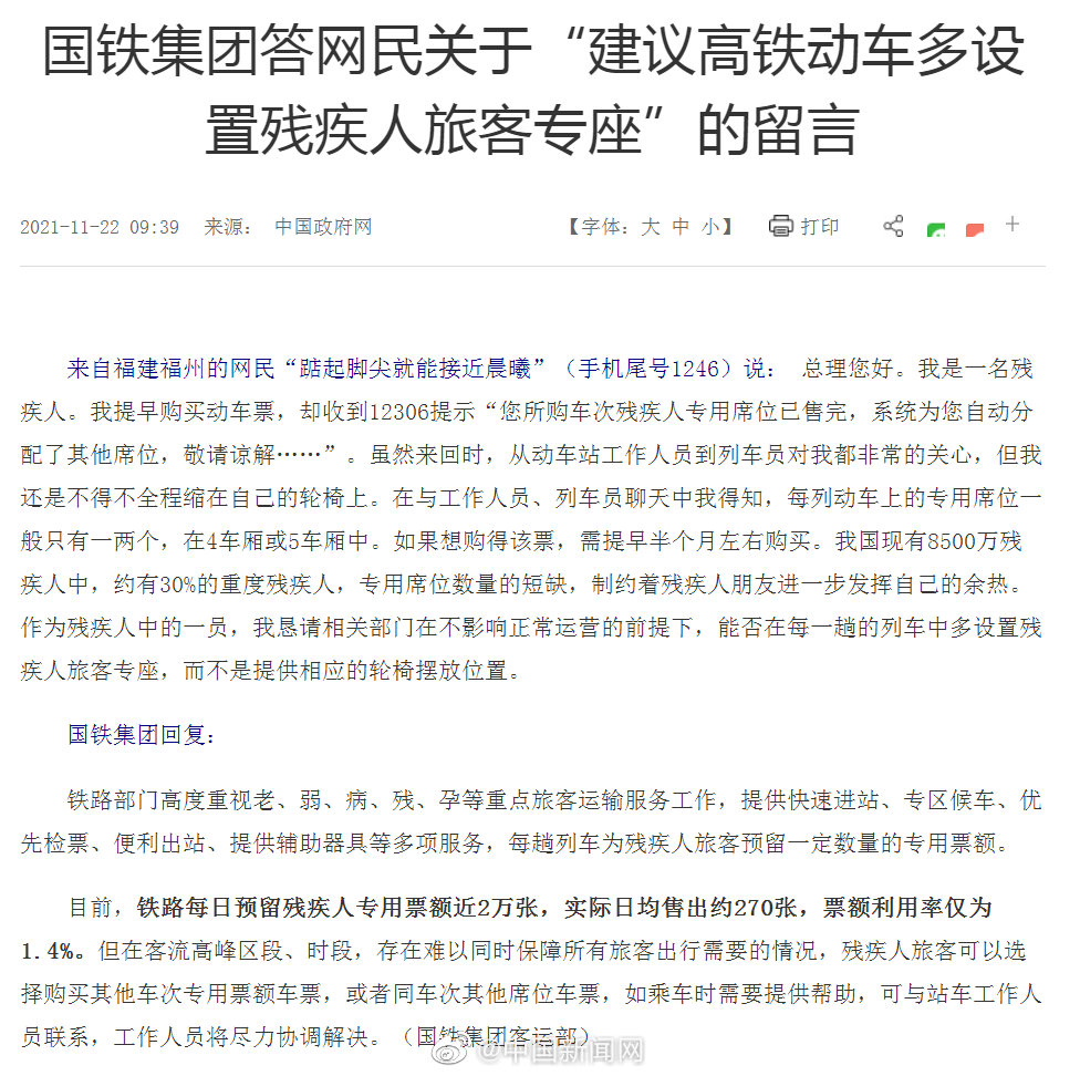 @中国新闻网 消息,据中国政府网11月22日发布,国铁集团答网民关于“建议高铁动车多设置残疾人旅客专座”的留言,目前,铁路每日预留残疾人专用票额近2万张,实际日均售出约270张,票额利用率仅为1.4%。但在客流高峰区段、时段,存在难以同时保障所有旅客出行需要的情况,残疾人旅客可以选择购买其他车次专用票额车票,或者同车次其他席位车票,如乘车时需要提供帮助,可与站车工作人员联系,工作人员将尽力协调解决。