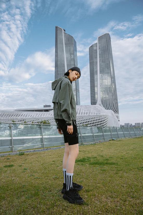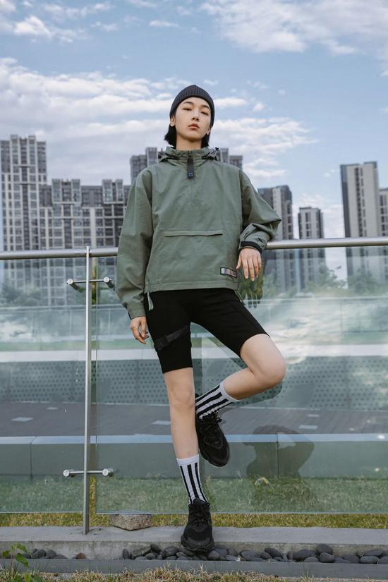 所以在搭配时也要注意好尺度的拿捏,宽松的半开式冲锋衣搭配骑行裤就是当下最流行的方式之一,斑马线条纹袜与黑色球鞋也让下半身有更多的亮点。