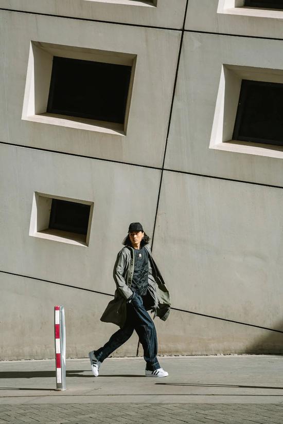 担心军绿色的机能风外套难搭的话,除了本身的运动搭法,也可以尝试用日杂中的 City Boy 风来尝试,只需记住外长内多的搭配理念即可。