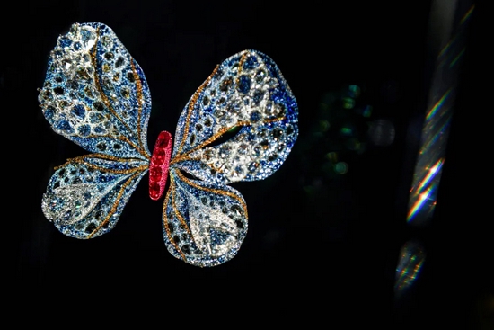 黄钻翅脉、蓝宝石蝶翼及钻石鳞翅,搭配色彩夺目的红宝石。红蓝配色如何搭配得高雅,在从美学上很有挑战。为了调出想要的颜色,红宝石周围的金属还第一次用铝材质,非常考验工艺。