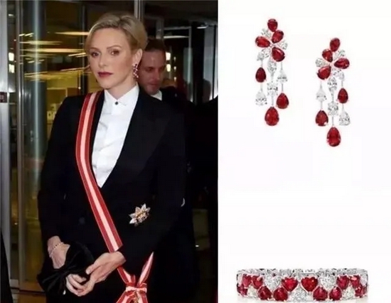 夏琳王妃也是红宝石珠宝爱好者,这条Graff豪华心形红宝石钻石拼接手链,红宝石重达46.9克拉;流苏长耳环也是Graff,有20克拉红宝石,大约70万美元(近500万)↓