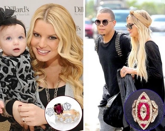 辛普森姐妹订婚时都选择了红宝石戒指,杰西卡的是一枚三石红宝石戒指,阿什利这枚比较有Art Deco风格~