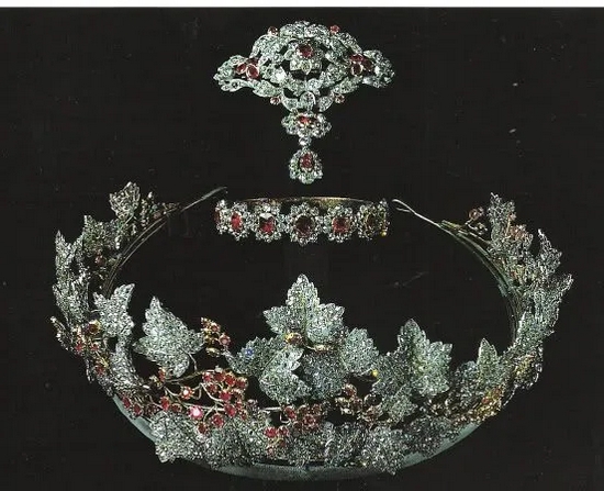 瑞典伯多纳特王朝的第一位王后德西里·克莱里,有一顶红宝石钻石王冠,钻石和红宝石交织出藤蔓与花的形状,带着童话般的浪漫色彩。