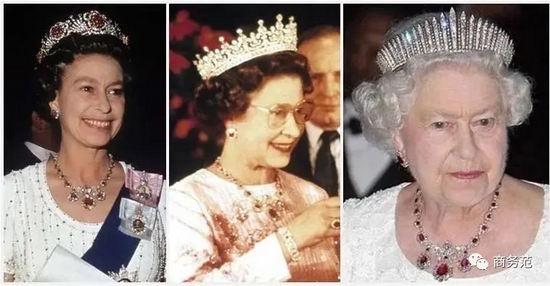 女王还在1964年自己购买了一条巴林红宝石项链,由3个大型红宝石吊坠和多个较小的红宝石组成,风格华丽,样子很吸引人眼球。