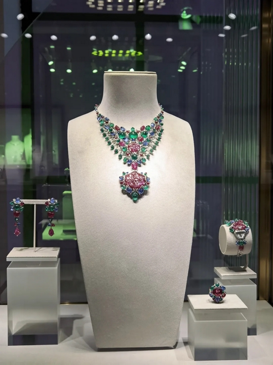 开头提到的卡地亚“第六感”高珠展上的UDYANA花园颂赞系列,就以红宝石为主要创作素材:不同形状和尺寸的各色雕刻宝石,在蜷曲的铂金枝叶上生长蔓延,勾勒出一首生机勃勃的花园颂歌。