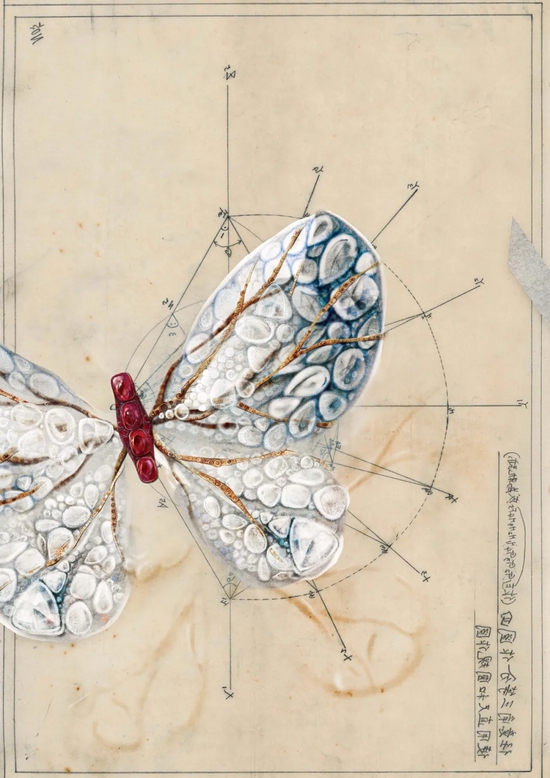 2019年的极光蝴蝶胸针,创作灵感源自Cindy建筑师外祖父手绘的建筑图。设计风格结合了早年汉式宫殿缜密的宏观建筑思维及结构线条,蝴蝶身体的细节一目了然。