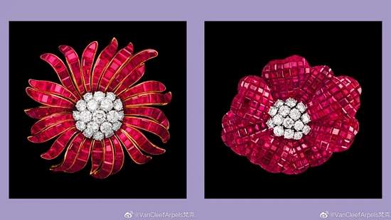 巴黎Florae展览上,还展出了两枚古董红宝石胸针——创作于1964年的Daisy和1956年的Pavot,生动勾勒了花朵轮廓及摇曳的婉约之姿~