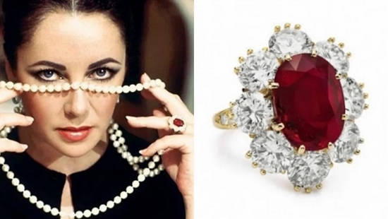 这枚重达8.24克拉缅甸红宝石戒指来自第五任丈夫理查德·伯顿,由Van Cleef&Arpels设计,在2011年拍卖会上成交价为420万美元(近3000万元)↓