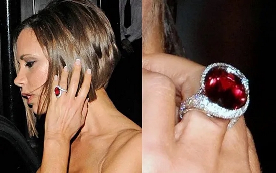其他明星的红宝石珠宝虽然没有泰勒这么壕,但也有不少可圈可点的。譬如收戒指收到手软的贝嫂,出街吃饭时佩戴过一枚价值80万英镑的红宝石“鸽子蛋”,后来还戴着它参加了Met Gala↓