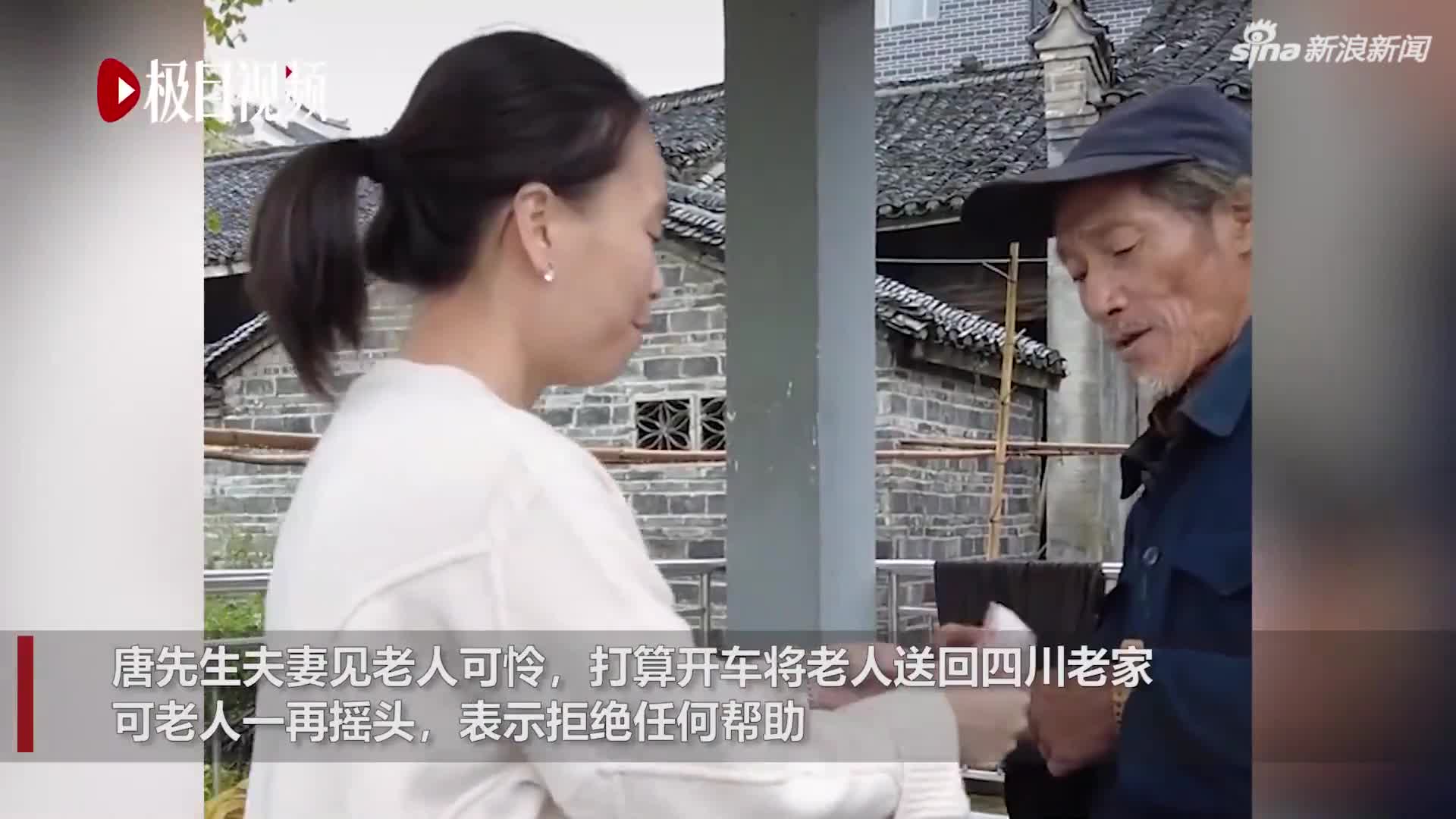 唐先生将双方的偶遇过程拍了下来。视频中,老人须发皆白,身形消瘦。他身背编织袋改的背包,拖着四轮小拖车。面对唐先生夫妻的询问,老人自称是四川德阳中江县双龙镇人,打算走回家去。唐先生夫妻见老人可怜,打算开车将老人送回四川老家,可老人一再摇头,表示拒绝任何帮助。