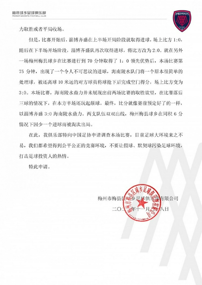 日前,中冠梅县球乡俱乐部向中国足协发函,请求调查中冠联赛总决赛海南陵水鼎力对阵淄博齐盛比赛中的异常情况。