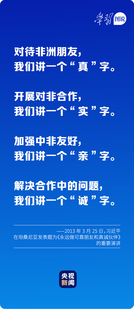 2013年3月,习近平就任国家主席后首次出访就选择了非洲,在坦桑尼亚尼雷尔国际会议中心发表演讲时提出真、实、亲、诚的对非政策理念和正确义利观。