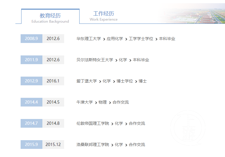 《90后!是博导!》公号文章透露,今年31岁的胡玥,从小成绩优秀,2008年以湖北省理科前800名的好成绩,选择了华东理工大学应用化学专业。大二时,在田禾院士和花建丽教授支持下,参加全国大学生创新创业项目,开展“染料敏化太阳能电池”研究。2年后,项目获国家级优秀项目奖、全国大学生节能减排大赛全国二等奖。