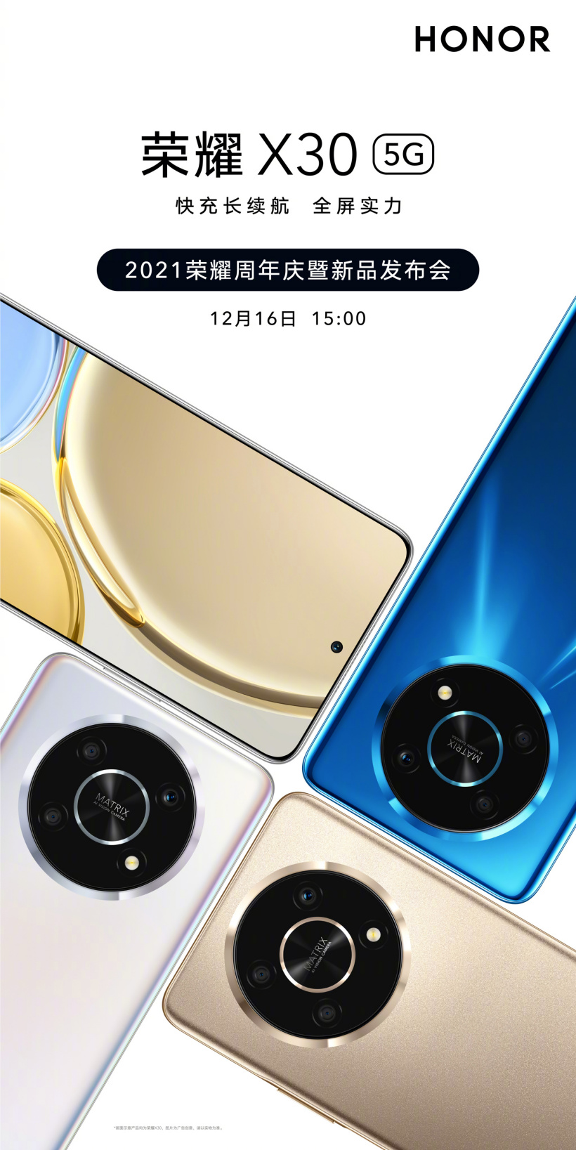 荣耀官方此前宣布,荣耀 X30 将于 12 月 16 日发布。荣耀手机今天发布了 X30 系列手机的预热海报。从海报内容我们可以看到,荣耀 X30 背部采用了高光星环设计,还有微型单打孔、超窄边大屏,三种配色。。。。。。