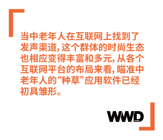 事实上,与时俱进的中老年人不但没有被时代抛下,反而成为互联网时代增速最快的群体。根据 QuestMobile 统计,截止 2020 年 5 月,50 岁以上的移动活跃设备用户规模已经超过 1 亿,是移动网民的重要增量来源;抖音、快手以及视频等短视频软件是他们的主要娱乐方式;虽然中老年人不擅评论,但 65.5% 的触媒用户习惯于转发、点赞、收藏等互动方式;触网老年人中,网购渗透率超过 40%,特别在疫情后,网购用户逆势增长 29.1%。当中老年人在互联网上找到了发声渠道,这个群体的时尚生态也相应变得丰富和多元,从各个互联网平台的布局来看,瞄准中老年人的“种草”应用软件已经初具雏形。