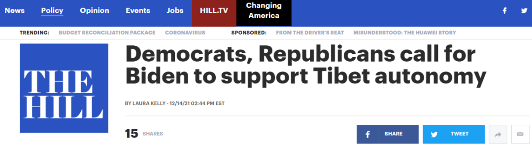 《国会山报》14日称,拜登上月与中国领导人举行视频会晤时,就提及对中国在西藏政策的“担忧”。美国《外交政策》杂志称,拜登政府一直在努力证明其对西藏的支持:今年2月,布林肯成为首位参加美国国务院主办的藏历新年庆祝活动的美国国务卿;拜登政府上任仅几个月,美国国务院的年度《各国人权报告》就删除了“西藏是中国的一部分”的描述,以往的报告历来采用确认西藏自治区是中国一部分的语言;美国国务院发言人普赖斯还在推特上向西藏“流亡政府”新当选的“司政”边巴次仁表示祝贺,这是一个前所未有的做法。