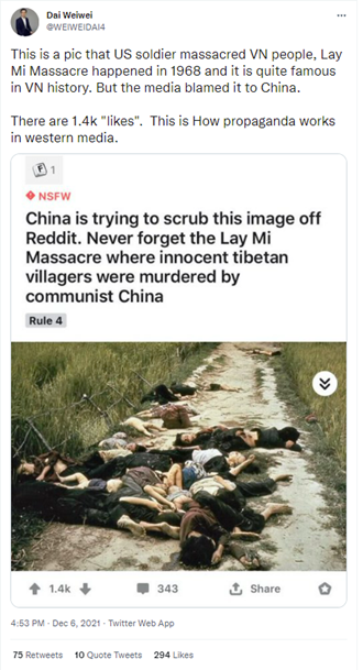 然而与此同时,有其它社交平台用户同样注意到了这张截图并进行了转发,推特用户@WEIWEIDAI4称图中照片表现的是发生在1968年的美军屠杀越南平民的“莱米”大屠杀,体现了西方媒体是如何煽动(民众)的,被其它用户提醒——“美莱”是越南的一个村庄,而“莱米”根本不是一种事物。此外多位微博用户也将该图转发至国内社交平台,将其视作敌视中国势力的恶劣行径。