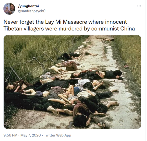 目前网传截图的最初来源及图片制作者的初衷已难以辨明,但可以明确,此图中的照片表现的是1968年3月16日美军在越南美莱村犯下的屠杀平民的暴行,与中国、中共和西藏无任何关联。