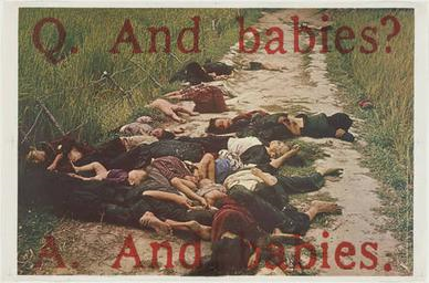 当时,美军屠杀事件已败露,国际社会哗然,两家媒体先后在1969年11月20日和12月5日刊登了这组照片。有艺术工作者将其中一张被《生活》杂志标注为“在村庄通往外界的小路上发现尸体”的照片加工成了海报,配上了屠杀参与者米德罗(Paul Meadlo)在接受哥伦比亚广播公司(CBS)电视新闻采访时的问答——