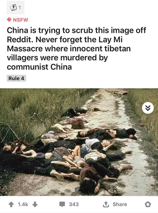 近日,微博、推特等平台流传一张来自Reddit的截图,图中有十数人陈尸于荒野,甚至还有儿童。相关文字称:“永远不要忘记莱米(Lay Mi,音译)大屠杀,无辜的西藏村民被中共杀害。”