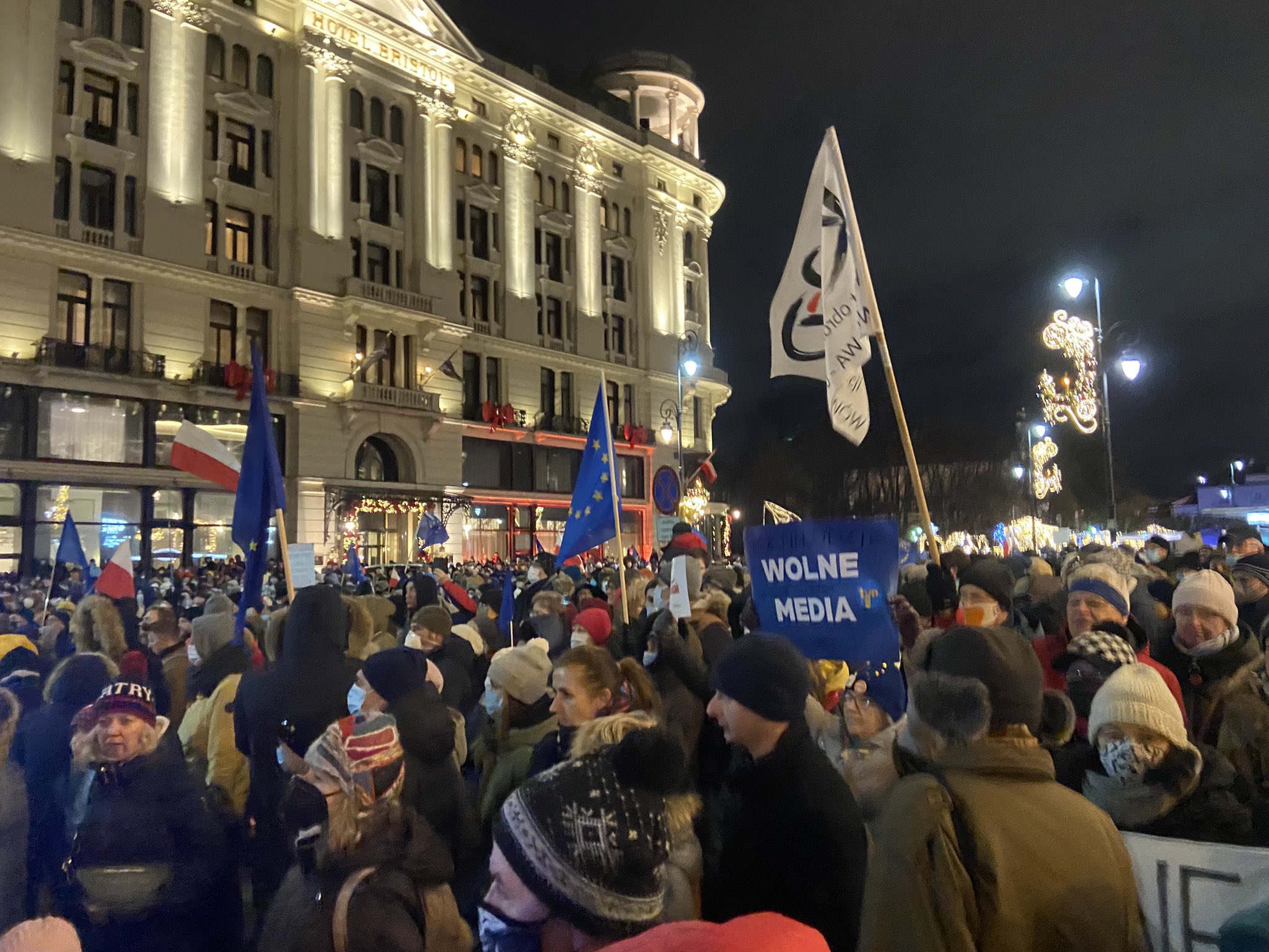 现场视频显示,华沙的示威者们挥舞着欧盟和波兰的旗帜,高呼“媒体自由”。在波兰南部城市克拉科夫,示威者挥舞着“别碰TVN”“自由波兰、自由人民、自由媒体”的标语。TVN24称,截至19日晚19时20分,已有逾150万人联署请愿书为TVN24辩护。