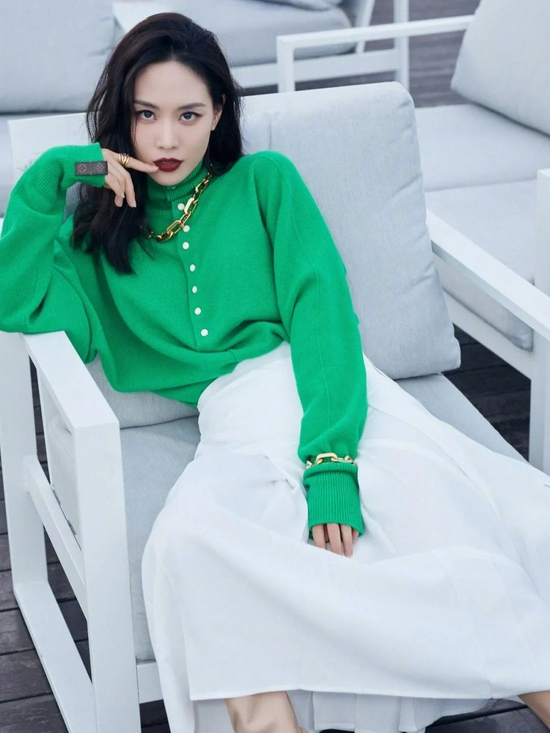 完全去掉袖子的披肩款式高领毛衣也是今年的热门款之一,可以像赵佳丽这样内搭轻薄面料的衬衫,错落的面料质感为其增添层次,对于不安于基础色的人来说,还能加入更多的色彩尝试。