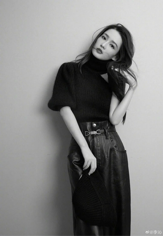切割感的设计细节,也能让一件基础款高领毛衣改头换面。李沁的这件不仅为肩部带来错视感,袖子的不对称处理,搭配酷飒皮革半身裙,时髦度瞬间提升。