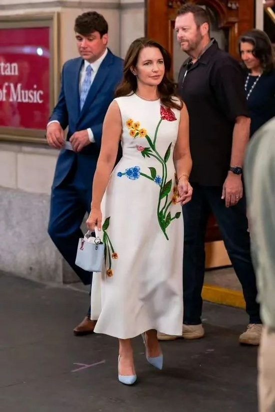在之后女儿 Lily 的钢琴演奏会上,Charlotte York 穿的是 Lela Rose 白色礼服裙,上面装饰着彩色花朵刺绣,并搭配了一个 Louis Vuitton 淡蓝色Capucines 。Rose 和 Lily则 穿着与母亲相衬的 Oscar de la Renta 立体花裙。