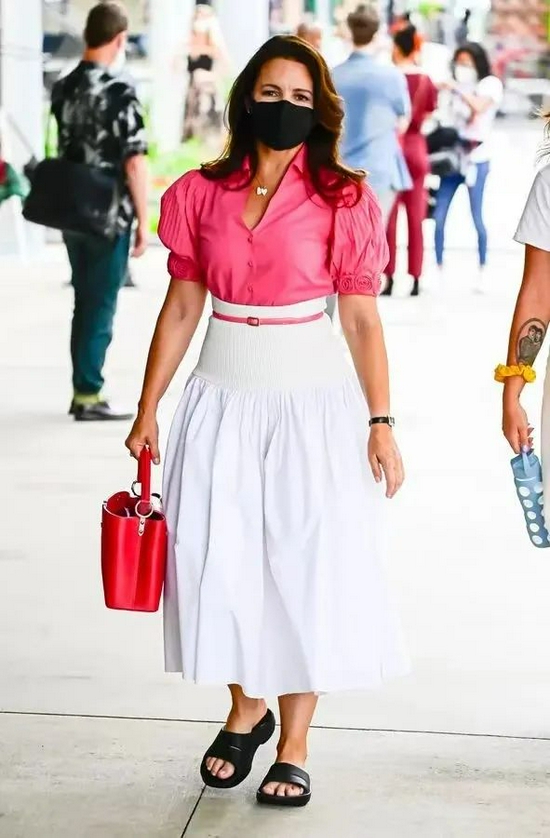 Charlotte York 的造型整体沿袭了她在原版中保守且优雅的着装风格,但这次她在时装选择中透露着与女儿 Rose 和 Lily 相呼应的小心思。她在这一集开场穿了一件 Go Silk 玫瑰色细节上衣,搭配 Alexander McQueen 的白色中长裙,手拎 Louis Vuitton 亮粉色 Capucines PM 包。