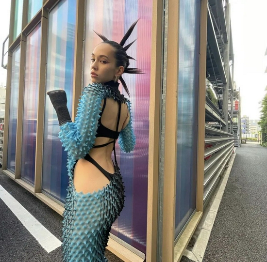 水原希子身穿渐变色裙装,来了个辣妹出街,加上大胆前卫的发型,把Y2K风拿捏得死死的。