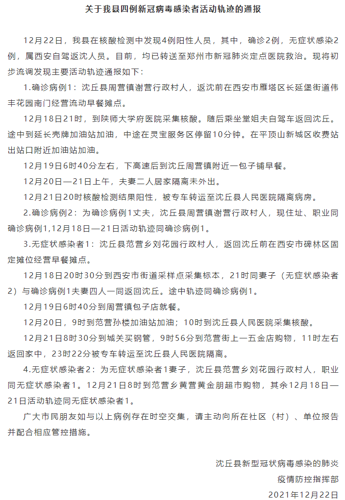 12月22日,河南周口沈丘县在核酸检测中发现4例阳性人员,其中,确诊2例,无症状感染2例,属西安自驾返沈人员。目前,均已转送至郑州市新冠肺炎定点医院救治。现将初步流调发现主要活动轨迹通报如下: