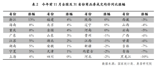 从商品房成交价格指标来看,数据显示,今年前 11 月,全国有10个省份商品房成交均价同比涨幅超过全国平均水平,有21个省份则弱于全国平均水平。另外,有13个省份出现了房价下跌现象,其中,黑龙江房价跌幅最大,为10%。而吉林房价跌幅7%,与青海并列第二。