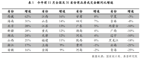 易居房地产研究院日前分析了全国31省份的房地产行情,从商品房成交金额指标来看,今年前11月,有15个省份成交金额同比增速超过全国平均水平,剩下的16个省份数据则低于全国平均水平,其中有10个省份数据为负。而黑龙江商品房成交金额同比增速为-18%,在31省份中排名第29 位,仅比云南和青海两省压力略小;吉林商品房成交金额同比增速为-8%,排名第25位。