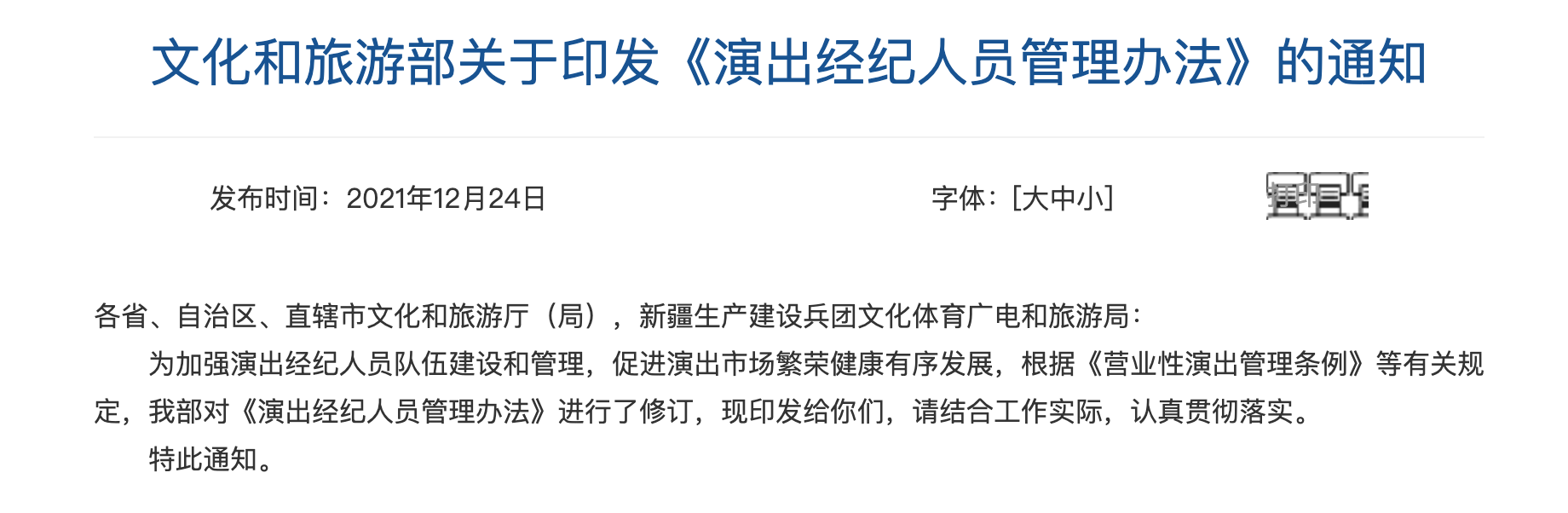 据文旅部官网24日消息,近日,文化和旅游部印发《演出经纪人员管理办法 》。