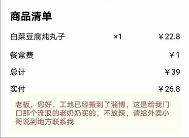 这份力量在备注的留言里。白菜豆腐炖丸子,一份特殊的外卖订单,收货人是“门口那个流浪的老奶奶”。这背后是因为,曾从他人赠送的热汤面感受到温暖,也想给予更多人温暖。
