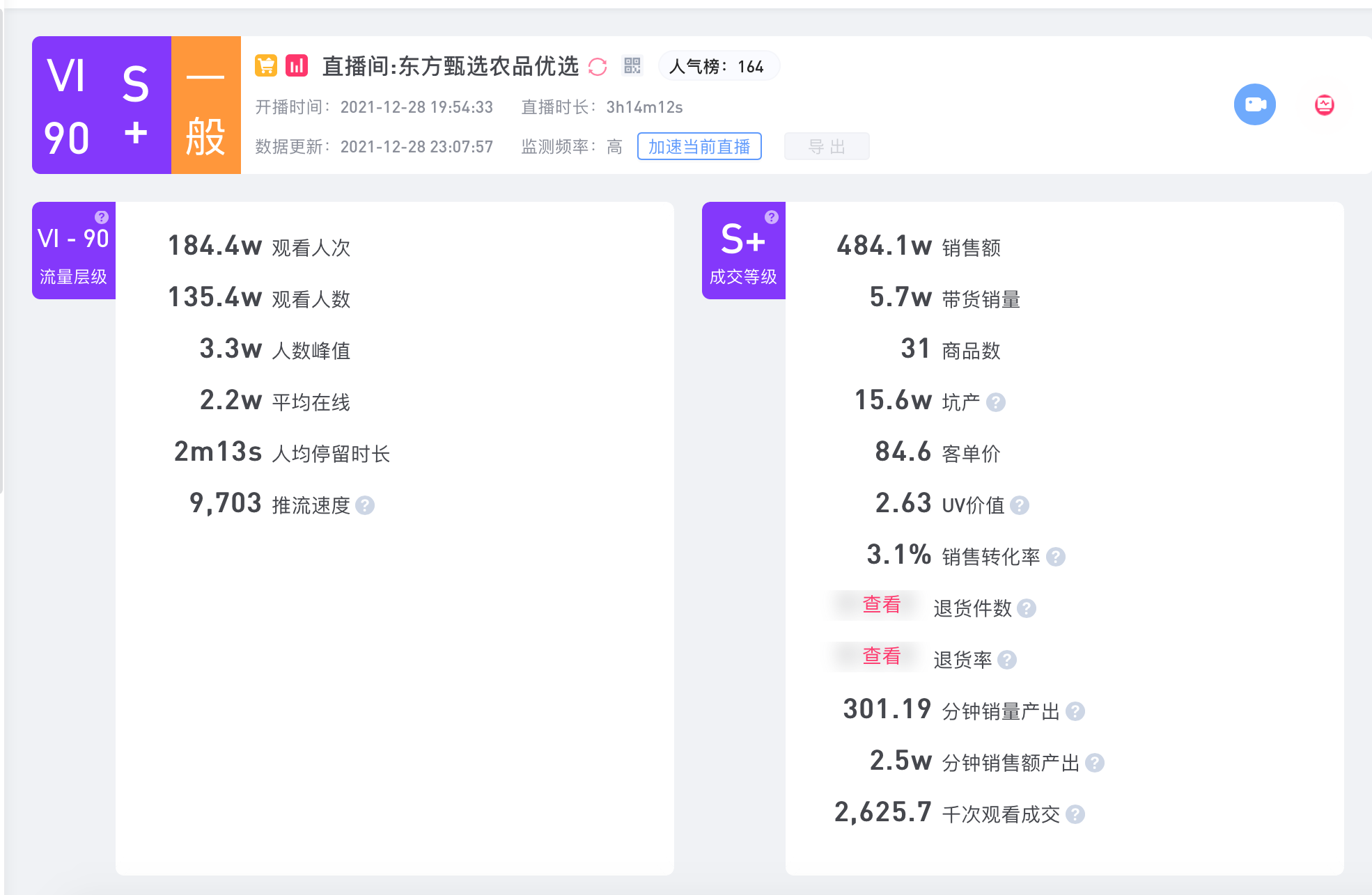 直播数据统计平台灰豚数据显示,本场直播观看人次达182万,人数峰值3.3万,直播销量5.7万件,直播销售额480.7万元。此前,俞敏洪曾在高管会议上说,“薇娅一年能卖一百多个亿,我带着几十个老师做直播是不是一年也能做上百亿?”