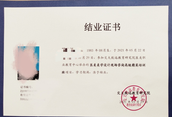 高级医美咨询师培训发两张证,一张是培训机构发的证书,一张是某职业能力等级中心颁发的证书,后者背后也是一家教育培训公司。