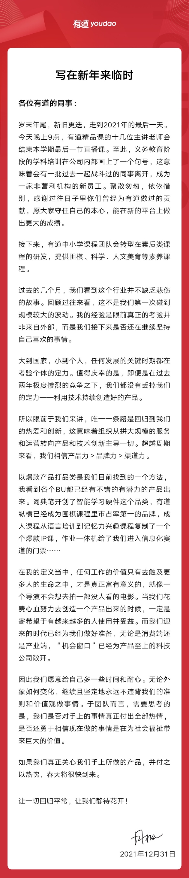 岁末年尾,新旧更迭,走到2021年的最后一天。今天晚上9点,有道精品课的十几位主讲老师会结束本学期最后一节直播课。至此,义务教育阶段的学科培训在公司内部画上了一个句号,这意味着会有一批过去一起战斗过的同事离开,成为一家非营利机构的新员工。聚散匆匆,依依惜别,感谢过往日子里你们曾经为有道做过的贡献,愿大家守住自己的本心,能在新的平台上做出更大的成绩。