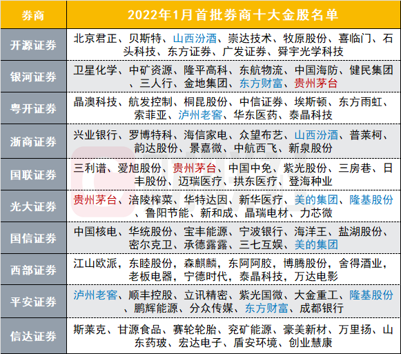 在新的一年,各路投资者重整河山待后生。目前,已有数家券商抢先发布了2022年1月的首批金股。除了东方财富和隆基股份等“熟面孔”,贵州茅台、泸州老窖等白酒龙头也继续被高度推荐。